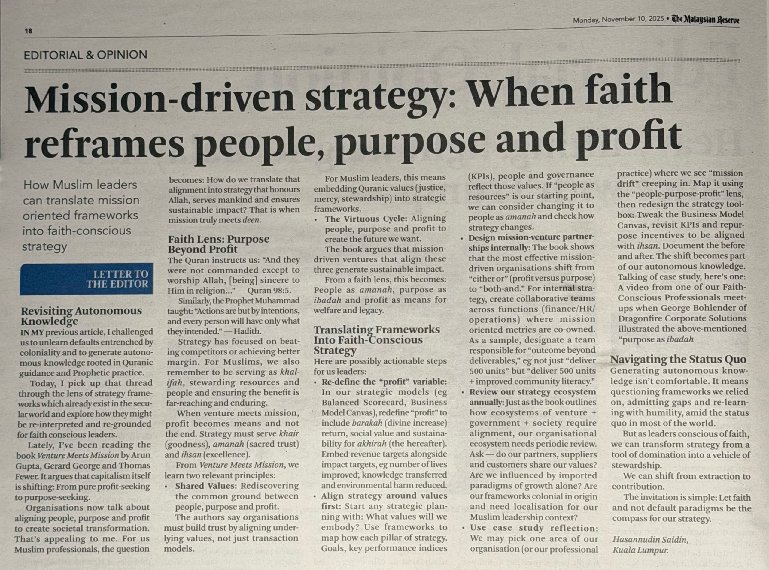 Organisations now talk about aligning people, purpose and profit to create societal transformation. That’s appealing to me. For us Muslim professionals, the question becomes: How do we translate that alignment into strategy that honours Allah, serves mankind and ensures sustainable impact? That is when mission truly meets deen.